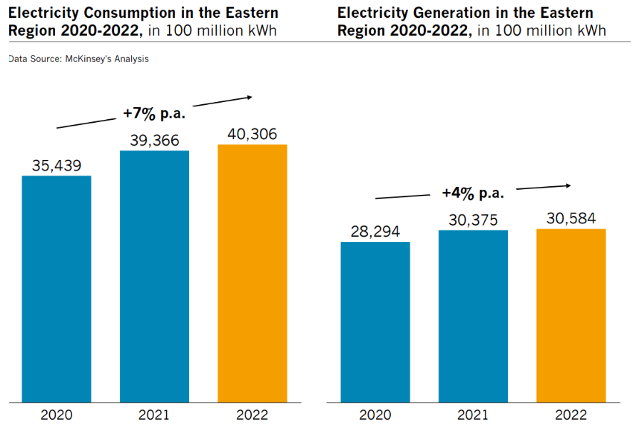 Sự dịch chuyển ấy không thể diễn ra đơn lẻ. Điện gió và thủy điện dự kiến đóng góp lớn, để đến năm 2060, nguồn tái tạo chiếm 80% tổng công suất phát điện quốc gia. Tuy nhiên, bức tranh chuyển dịch càng căng thẳng trong bối cảnh thiếu hụt điện năng nghiêm trọng ở vùng phía Đông Trung Quốc. Năm 2022, nhu cầu điện năng ở vùng này vượt 4.000 tỷ kWh, trong khi sản lượng phát điện chỉ đạt khoảng 3.000 tỷ kWh, dẫn đến thiếu hụt 1.000 tỷ kWh.