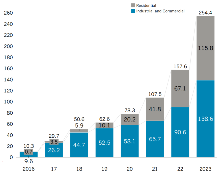 Theo Cục Năng lượng Quốc gia Trung Quốc, đến cuối năm 2024, tổng công suất lắp đặt đã đạt 370 GW, gấp 121 lần so với cuối năm 2013. Chỉ riêng diện tích mái nhà nông thôn ước tính 27,3 tỷ m2, có thể tạo ra công suất lắp đặt gần 2 tỷ kW, với sản lượng điện hàng năm 2,5 nghìn tỷ kWh, đủ bù đắp thiếu hụt 1.000 tỷ kWh ở Đông Trung Quốc, đáp ứng gần như toàn bộ nhu cầu điện hộ nông thôn, cũng như cung ứng cho các ngành nông – lâm nghiệp (khoảng 550 tỷ kWh).