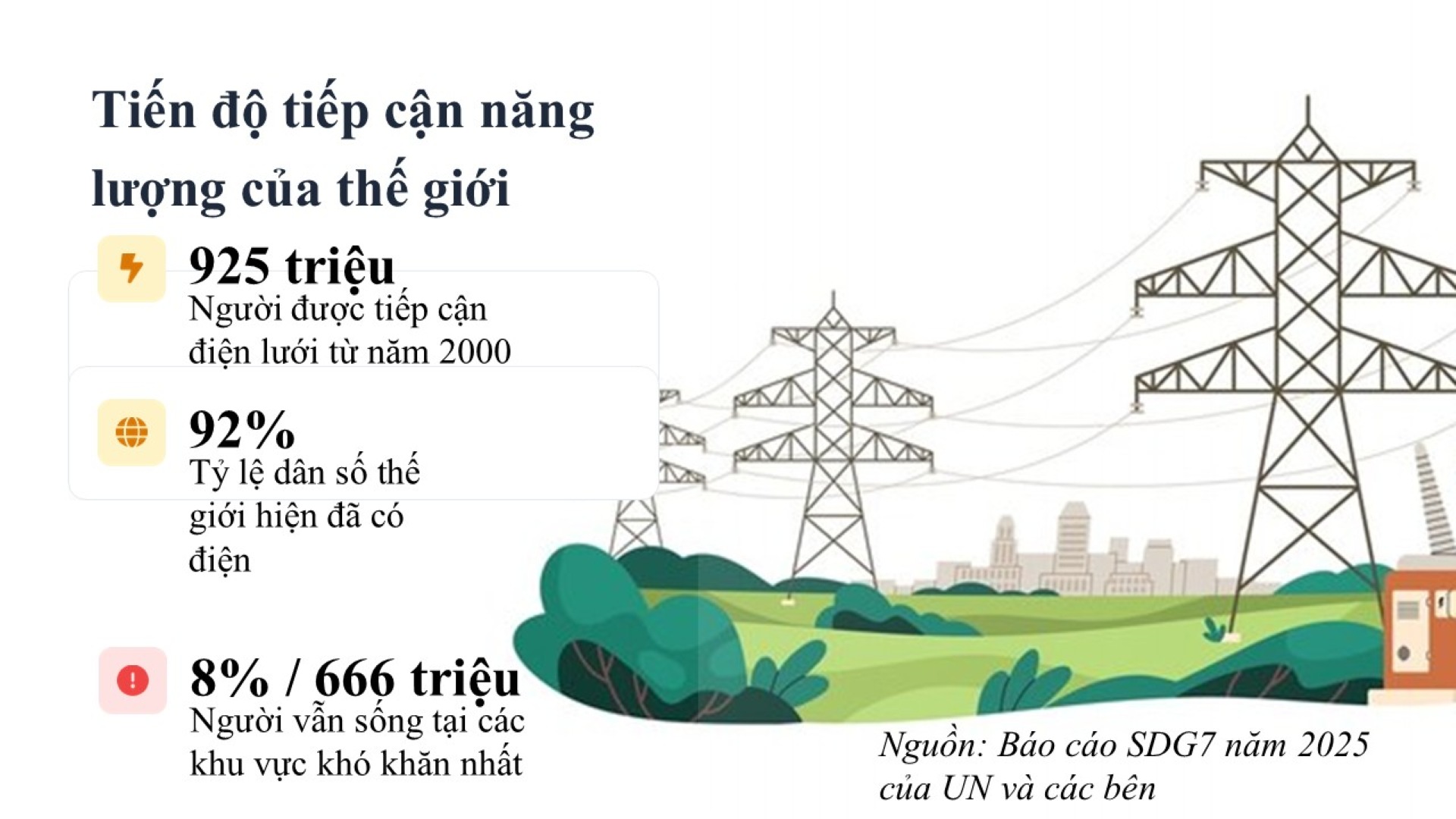 Theo báo cáo Mục tiêu Phát triển Bền vững số 7 năm 2025 (SDG7 – mục tiêu về năng lượng sạch và giá rẻ cho tất cả mọi người), thế giới đã giúp hơn 925 triệu người tiếp cận được điện lưới kể từ đầu thế kỷ này. Đây là một nỗ lực lớn, nâng tỷ lệ có điện toàn cầu lên mức 92%.