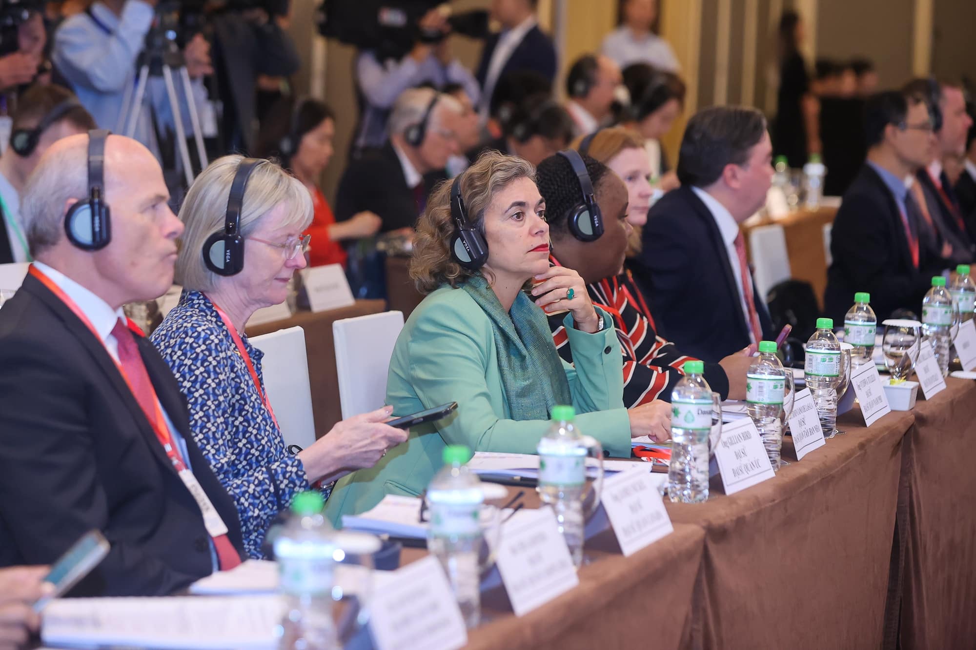 Về các kiến nghị, đề xuất của doanh nghiệp, Thủ tướng nêu rõ, Việt Nam luôn cởi mở, cầu thị, sẵn sàng đối thoại thẳng thắn, cùng nhau tìm kiếm giải pháp, tháo gỡ các khó khăn, vướng mắc để thúc đẩy phát triển kinh tế nhanh và bền vững với giải pháp cốt lõi là chuyển đổi xanh, chuyển đổi số, tinh thần “không có gì là không thể”, “cùng lắng nghe, cùng thấu hiểu, cùng niềm tin, cùng khát vọng, cùng làm, cùng thắng, cùng hưởng”, “lợi ích hài hòa, rủi ro chia sẻ”.