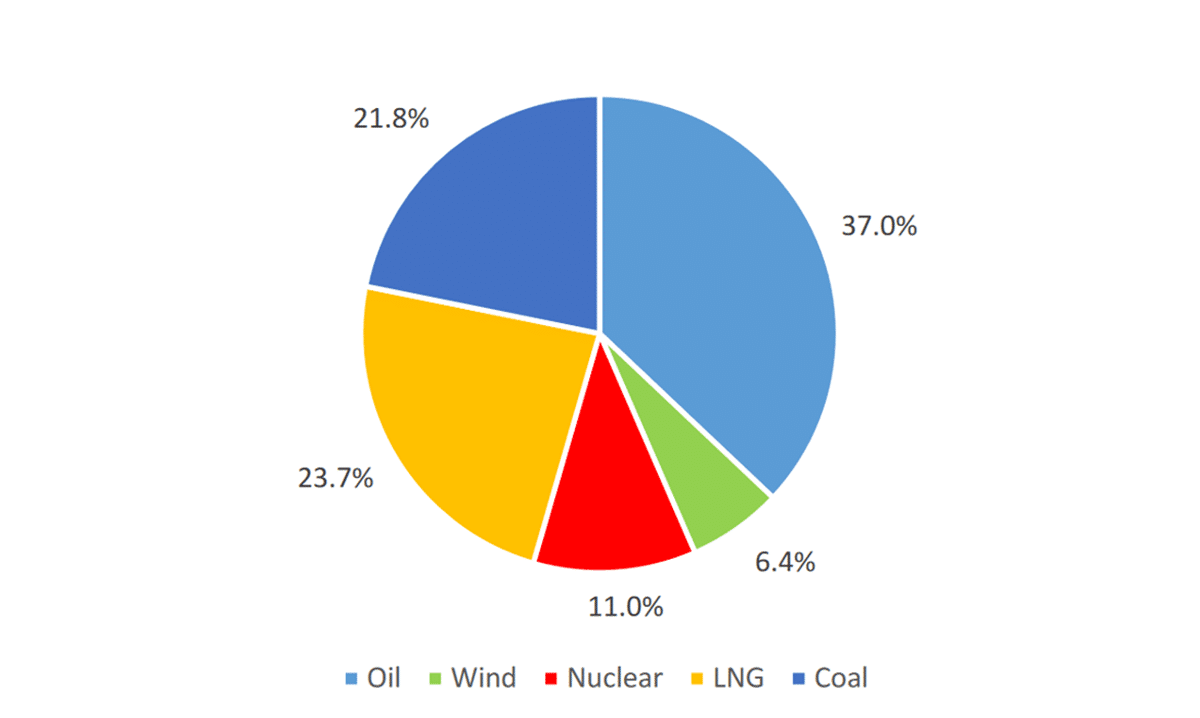 Hệ thống năng lượng Hàn Quốc hiện nay vẫn chủ yếu dựa vào nhiên liệu hóa thạch. Cụ thể, dầu mỏ chiếm tới 37% tổng năng lượng, than đá 21,8% và khí thiên nhiên hóa lỏng (LNG) 23,7%, trong khi năng lượng hạt nhân đóng góp 11%. Năng lượng tái tạo, bao gồm cả gió và mặt trời, chỉ chiếm 6,4% tổng lượng điện phát ra, với riêng gió và mặt trời chỉ đạt 3,8% (tương đương 21 TWh), thấp nhất trong nhóm G20, chỉ sau Saudi Arabia.