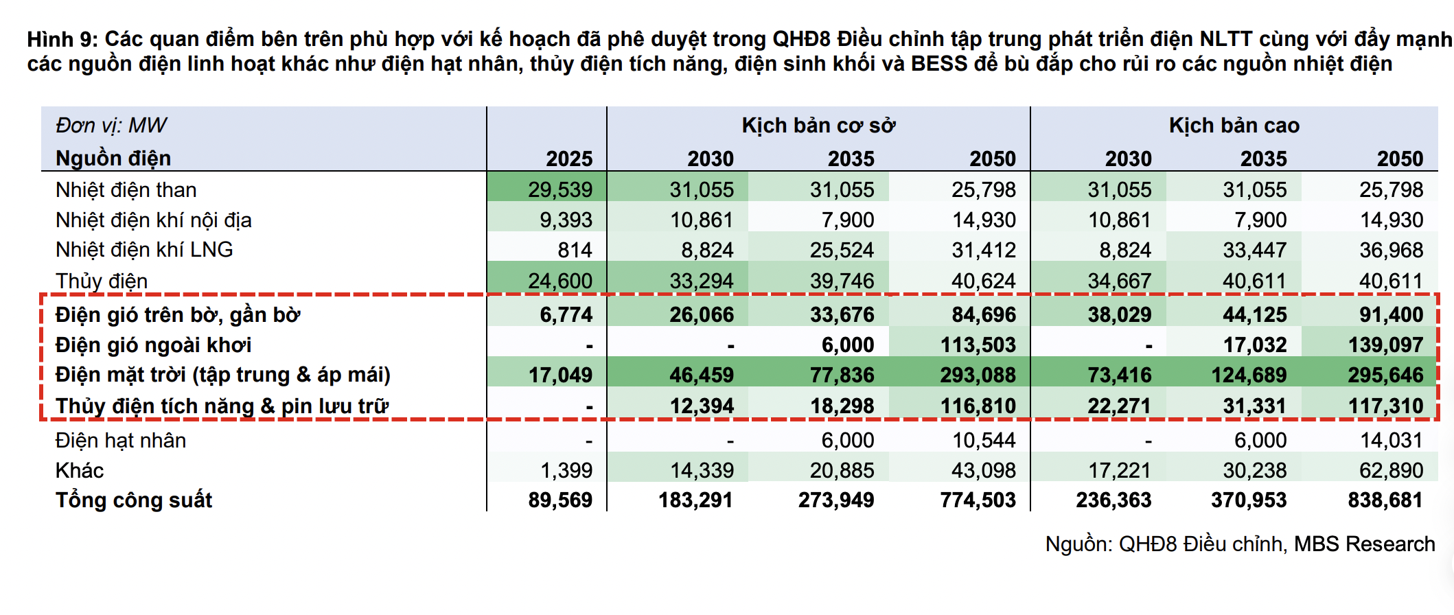 Cụ thể, để bù đắp cho các nguồn điện nền quan trọng đang gặp rủi ro chậm tiến độ như Nhiệt điện (than, khí), điện gió ngoài khơi, Chính phủ khởi động lại chương trình Điện hạt nhân (Ninh Thuận 1&2), tăng cường bổ sung các nguồn điện linh hoạt như BESS, Thủy điện tích năng, điện sinh khối, và đặc biệt quyết tâm đẩy mạnh các nguồn điện năng lượng tái tạo (Điện gió, điện mặt trời).