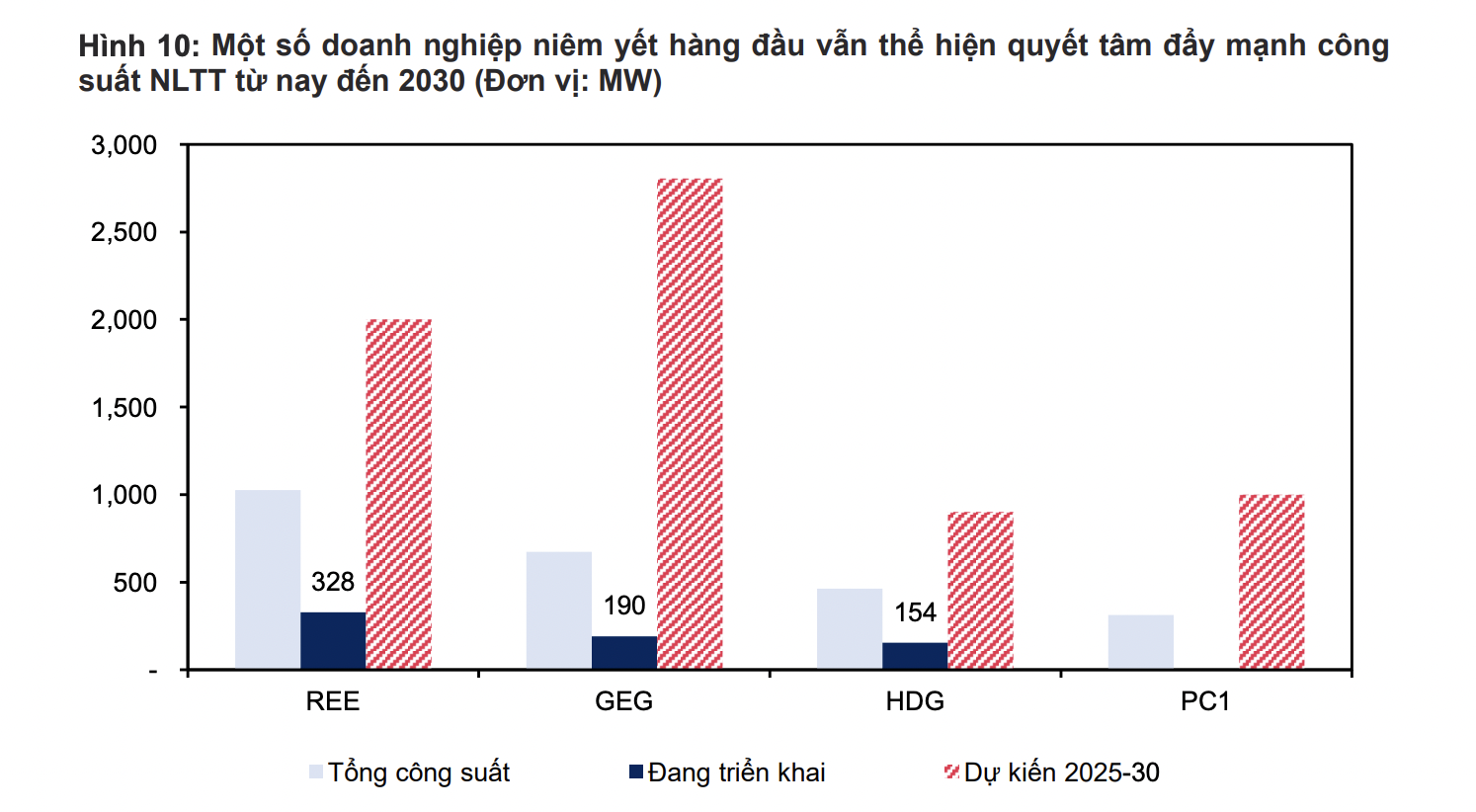 Quan sát các nhà phát triển năng lượng tái tạo trên sàn như REE, HDG, GEG, có sự sôi động trở lại trong kế hoạch triển khai. Bên cạnh đó, nhu cầu ngày càng tăng đối với năng lượng tái tạo kéo theo nguồn việc lớn cho các doanh nghiệp nhà thầu xây lắp, nổi bật như PC1, TV2.