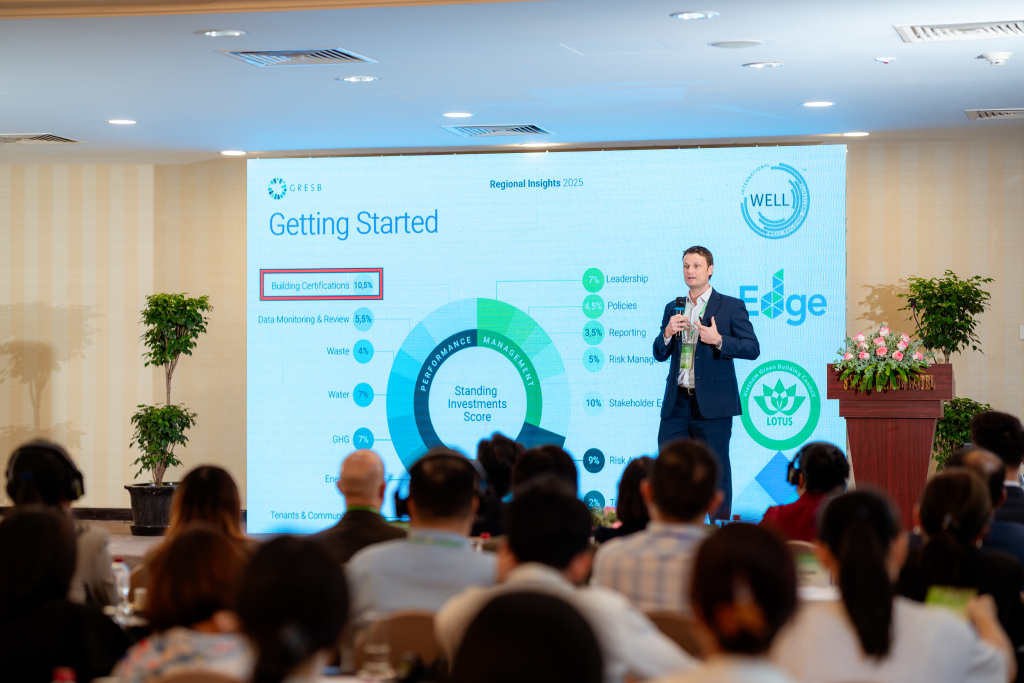 Ông Trey Archer, Giám đốc Phát triển Kinh doanh GRESB, cung cấp bức tranh chi tiết về lợi ích đo được của phát triển bền vững. Theo GRESB, doanh nghiệp bất động sản áp dụng tiêu chuẩn xanh có thể giảm đến 30% năng lượng, 20–25% nước và cắt giảm trung bình 5,5% khí thải nhà kính – mức cao vượt trội so với trung bình châu Á.