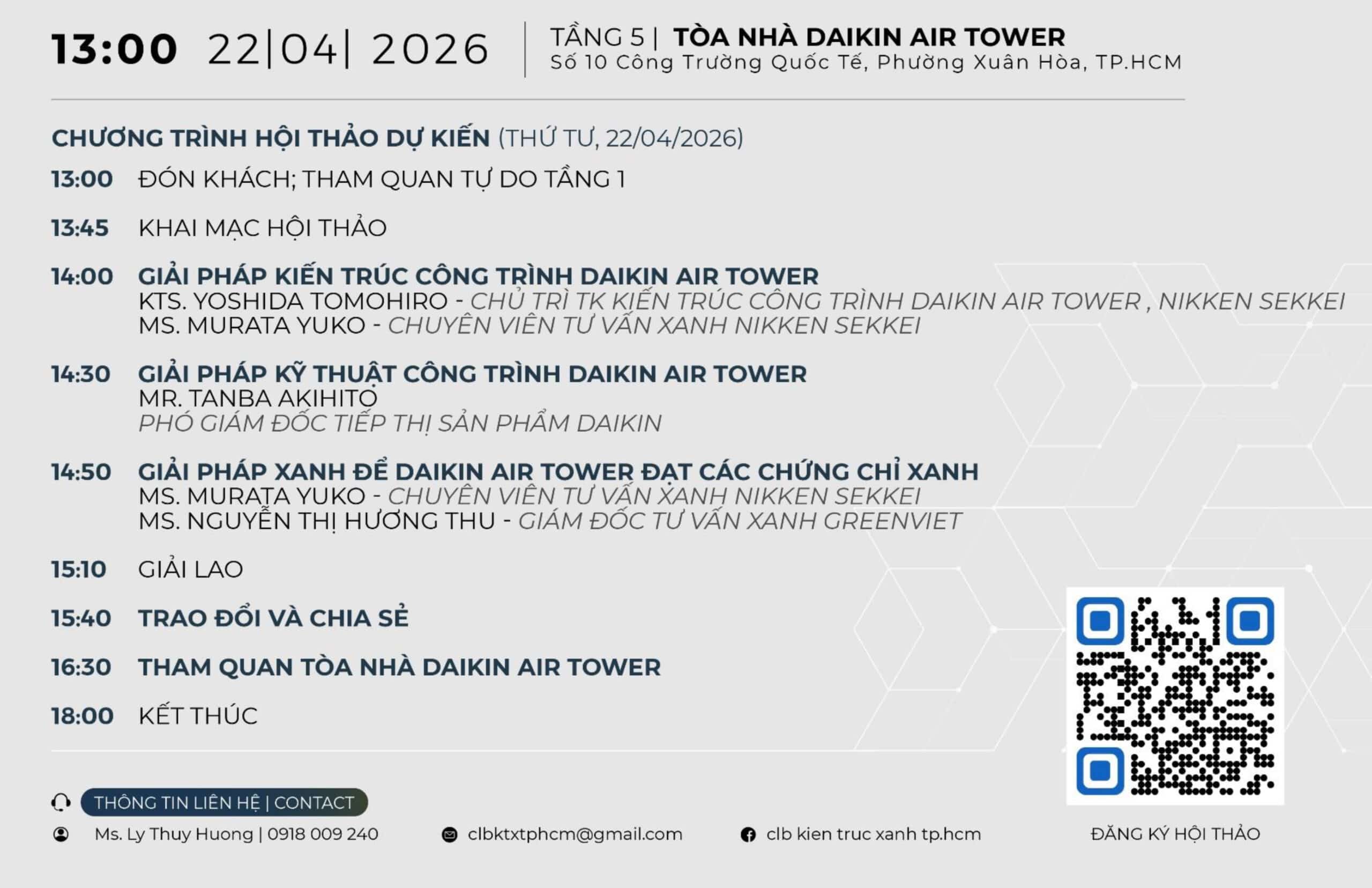 Chương trình lần này với chủ đề Green Daikin Air Tower (Daikin Vietnam) tập trung giới thiệu các giải pháp Kiến trúc, Cơ điện và công trình xanh được ứng dụng trong tòa nhà đầu tiên tại Việt Nam đạt đồng thời ba chứng chỉ công trình xanh ở cấp độ cao nhất: LEED, LOTUS và WELL. Thông qua các phần trình bày chuyên môn và tham quan thực tế, chương trình mang đến góc nhìn toàn diện về quá trình thiết kế, triển khai và vận hành một công trình theo các tiêu chuẩn bền vững quốc tế.