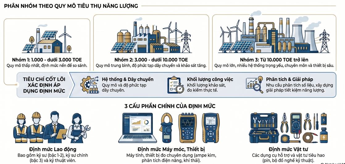 Trong chương trình tư vấn do Bộ Công Thương tổ chức với sự tham gia của một số tổ chức quốc tế nhằm “Xây dựng định mức kinh tế – kỹ thuật cho hoạt động tư vấn hiệu quả năng lượng tại Việt Nam”, bộ này đã công bố dự thảo định mức kinh tế – kỹ thuật. Theo đó, dự thảo nhắm trực diện vào việc chuẩn hóa ba cấu phần then chốt: lao động, thiết bị và vật tư. Điểm đột phá của dự thảo là cách phân nhóm doanh nghiệp theo mức tiêu thụ năng lượng (1.000 – 3.000 TOE, 3.000 – 10.000 TOE và trên 10.000 TOE) để phản ánh đúng mức độ phức tạp của hệ thống kỹ thuật thay vì chỉ chia theo cảm tính.