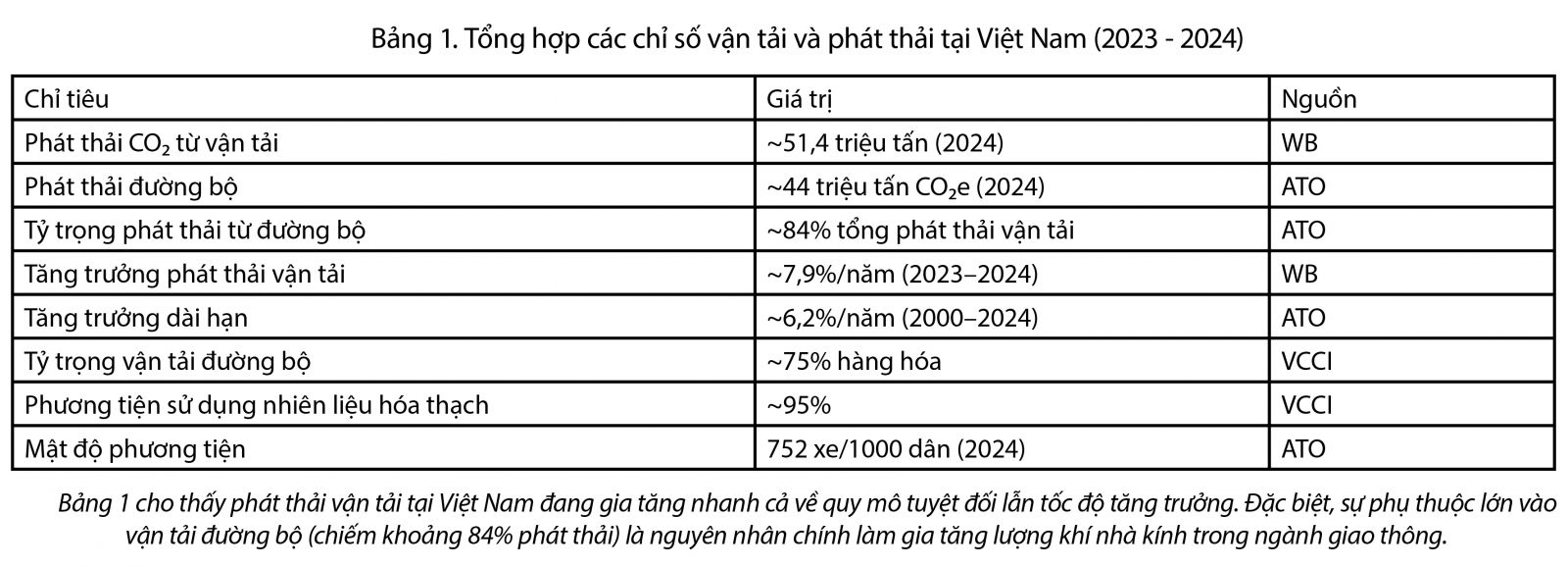 Đặc biệt, theo Ngân hàng Thế giới (WB), tổng lượng phát thải từ hoạt động vận tải tại Việt Nam đạt hơn 50 triệu tấn CO₂/năm (WB, 2024), và có xu hướng tăng nhanh nếu không có biện pháp kiểm soát hiệu quả.